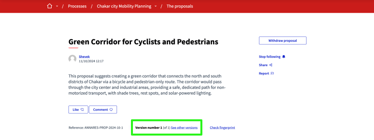 The versions feature allows a visitor to see the evolution of the different versions of resources that can be edited, like proposals or results.